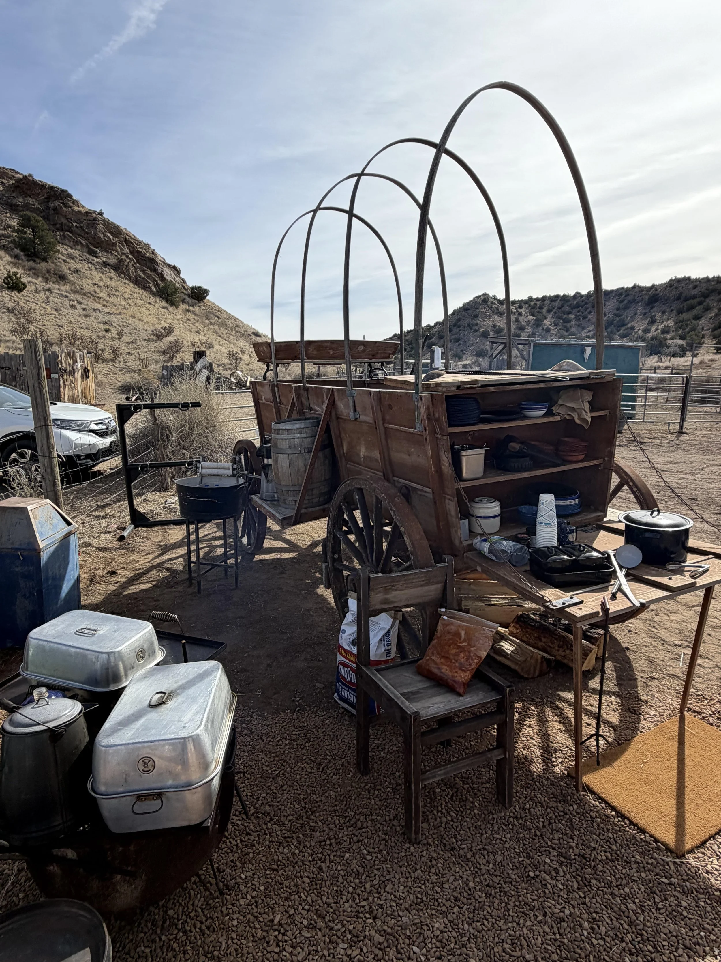 We offer an outdoor shady seating area for up to approximately 50 guests with picnic tables, handcrafted wood seating sections and folding tables and chairs for a fee. We also have a classic Chuckwagon for serving. Trash cans & coolers are available for your use. Current setup seats about 15 guests. Curated experiences such as horseback riding, horse feeding and ancient turquoise mine jeep tours can be curated for your group. To inquire, please call the Business Manager at: 505-570-7991.